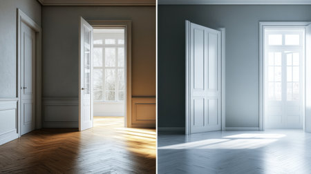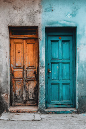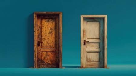 Two doors stand side by side, one old and worn while the other is new and clean, symbolizing change and transition in life.
