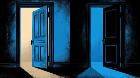 A symbolic office hallway with two doors, one brightly lit in yellow and other in shadow in blue, representing professional choice and contrast