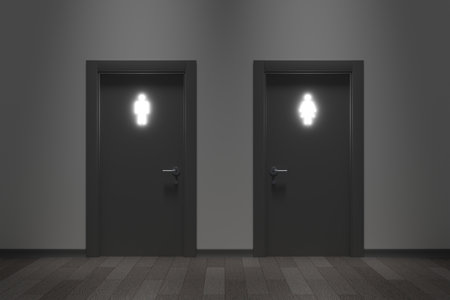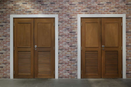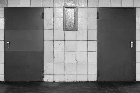 Old plastic man and woman toilet or rest room closed on the white wall with copy space - Retro or Vintage and Background concept