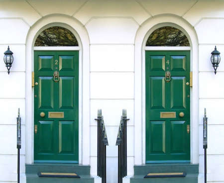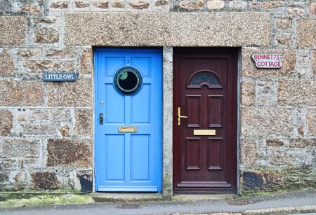 Colorful red and turquoise entrance doors on a facade of a traditional house in Edinburgh, Scotland