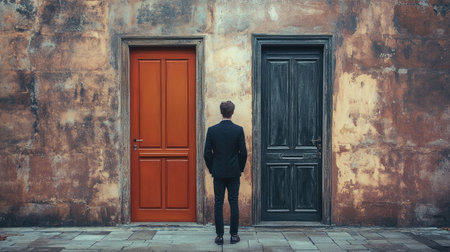 A man standing in front of two doors, one modern and bright, the other old and worn, symbolizing choices between innovation and tradition, progress and comfort