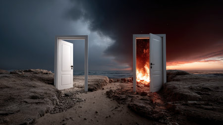 This surreal image features two distinct doors set in a barren landscape, symbolizing choices and possibilities. The dramatic sky creates an otherworldly atmosphere.