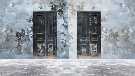 Twin black doors set in a deteriorating concrete wall, with peeling paint and a sense of abandonment, evoking a mysterious or historic vibe.