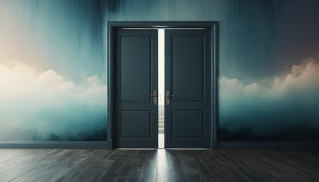 Two door icons shown in contrasting black and blue colors are displayed, illustrating a concept of choice and opportunity in a digital format.