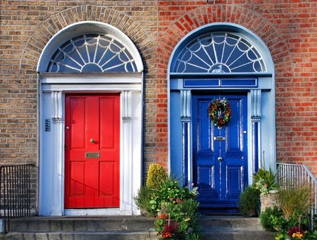 Colorful georgian doors in Dublin, Ireland. Historic doors in different colors painted as protest against English King George legal reign over the city of Dublin in Ireland.