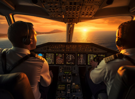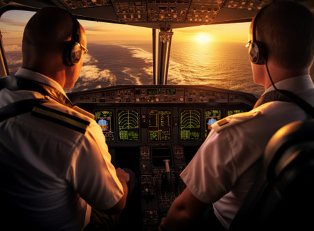 Two white male pilots in an airplane cockpit during a sunset flight. Concept of aviation, teamwork, piloting, flight safety.