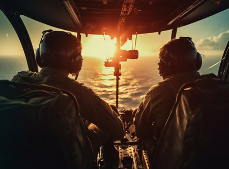 Silhouette of two pilot men in helicopter cockpit at sunset.