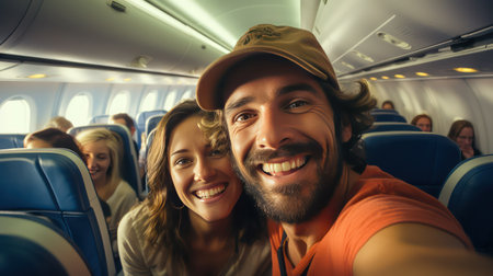 Happy young couple taking selfie on airplane, close-up. Traveling together concept