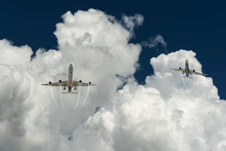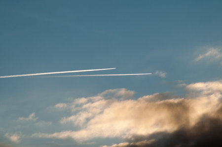 Aircraft condensation contrails in the blue sky inbetween some beautiful clouds