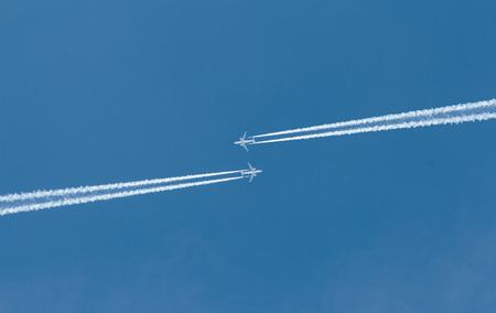 two planes in the sky, two airplane tracks in the blue sky, contrails