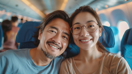 A cheerful woman and a distinguished older man sit side by side on an airplane, radiating happiness. Their warm smiles and cozy attire create a sense of connection and adventure, perfect for travel enthusiasts.
