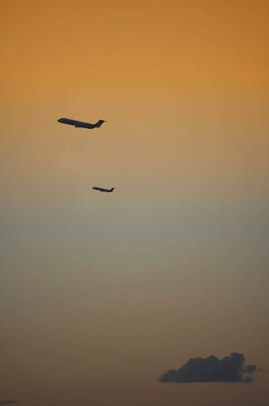Silhouette of the Airplane over Beautiful Orange Sky. Sunset Background. Travel and Vacation Concept.