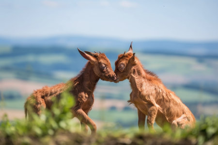 a pair of tiny goats head-butting each other in the sunshine, with a view of rolling hills in the background, created with generative ai