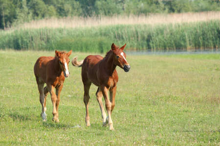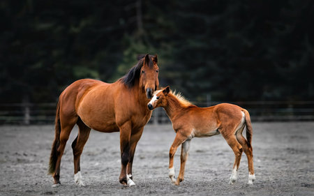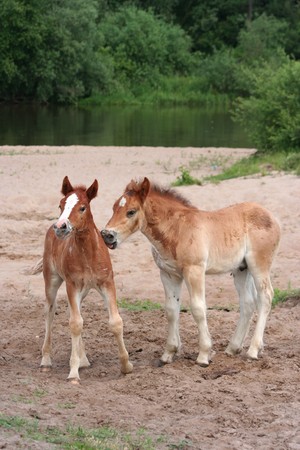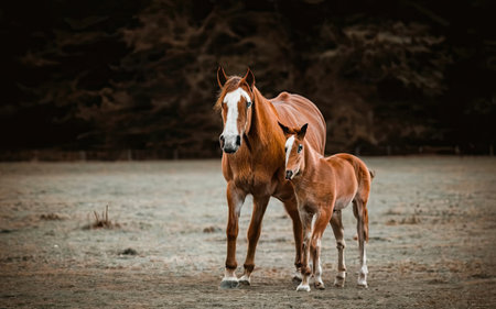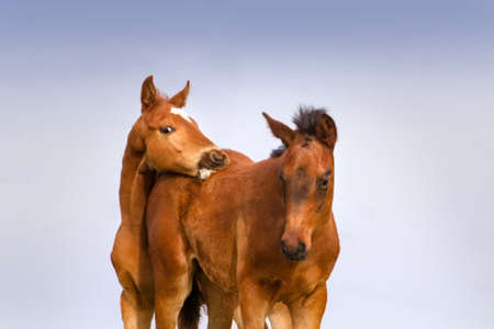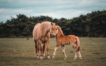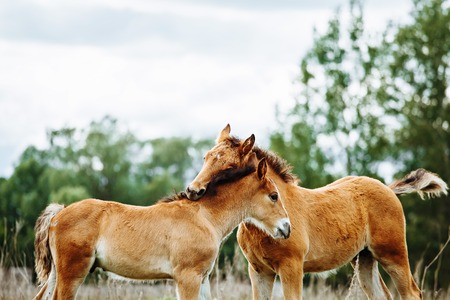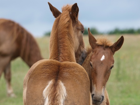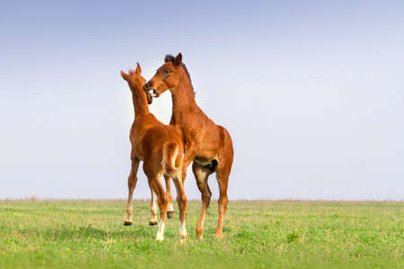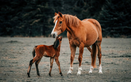 Red foal sporting breed with a mare. Small horse. Foal with an asterisk on a forehead.