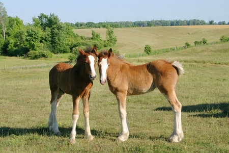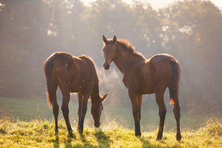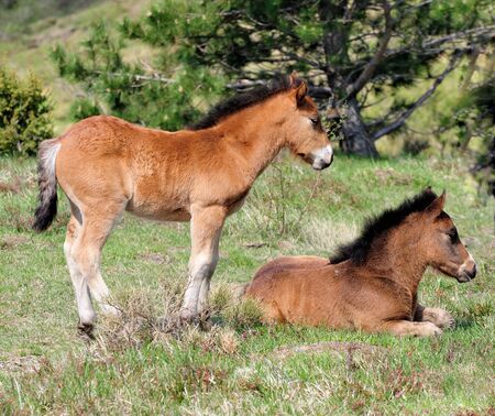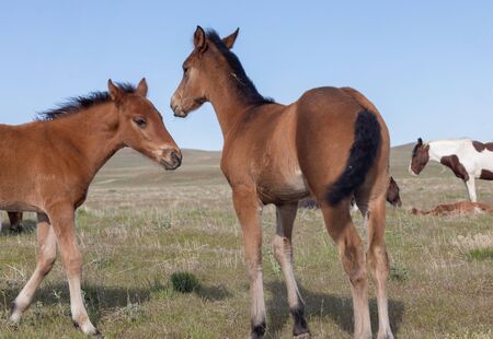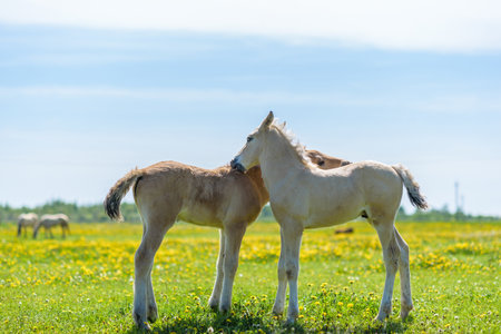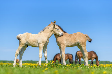 two gray, dun colored sweet foals playing and staying together in the meadow