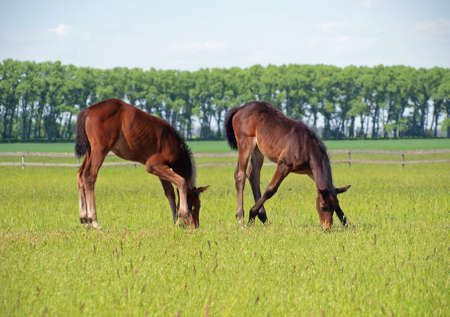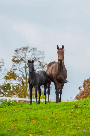 Two horses standing on green meadow in sunny summer day. Beautiful mare with foal.