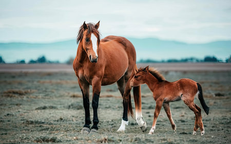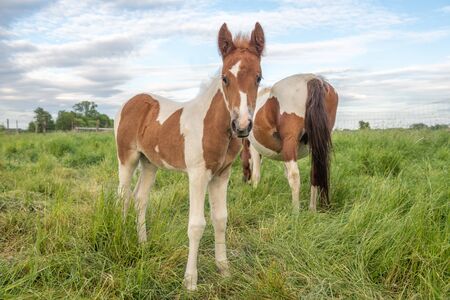 Funny photo of newborn foal and mother mare on green meadow. Mare is wagging her tail.