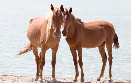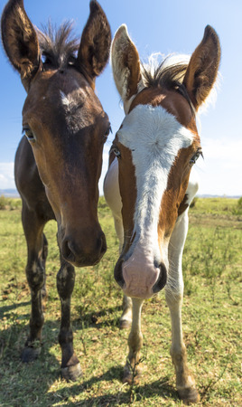 Brown and pinto foals grazing near the sea in Apulia (Italy)