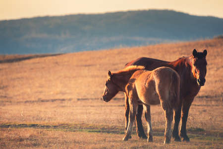 Two brown horses in the mountains at sunset. Beautiful autumn landscape. South Ural, Russia