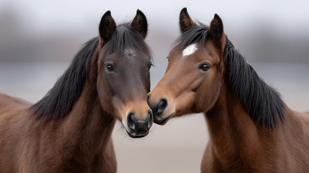 close-up of a mares muzzle touching her foals forehead, created with generative ai