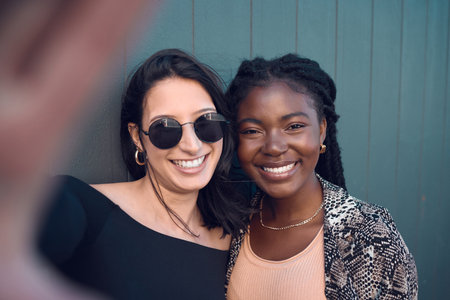 happy woman with different skin color friend spending good time together; concept of ethnicity and skin color difference tolerance, love and peace, friendship, social diversity