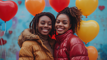 Young lesbian couple with heart-shaped balloons on blue background. Valentine's Day celebration.