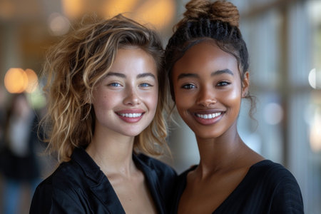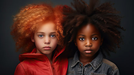 Afro-american and caucasian young girls closeup with the same hair style, Generative AI