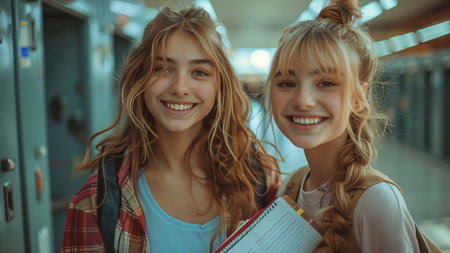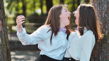 Two joyful young friends share a bright outdoor moment, exuding happiness and togetherness in a casual setting. Their smiles capture the essence of carefree youth.
