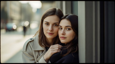 Portrait of two beautiful women looking through the window of a building