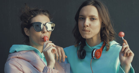 Young women licking sucking red lollipops and smiling . Portrait of two beautiful happy female girl friends . Urban city lifestyle
