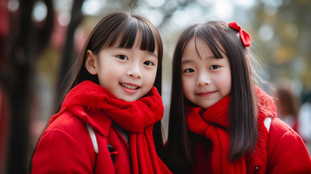 Portrait of two beautiful little girls in red jacket on the street