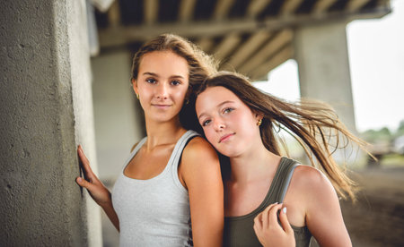 Beautiful twin sisters bonding and having fun outdoors