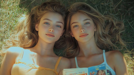 Two young women lie on the grass in a park, enjoying a book together. The sun filters through the trees, creating a warm and relaxed atmosphere as they share moments of laughter and joy.