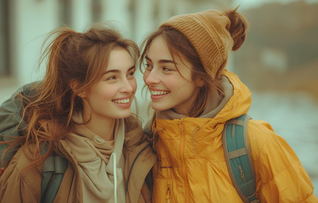 Two happy young women in warm clothing and backpacks sharing a joyful moment outdoors.