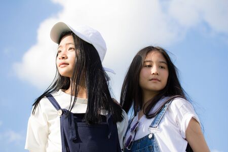 Portrait of two young asian girls on blue sky background.
