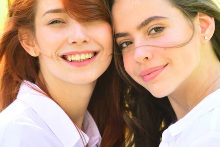 Close up portrait. Two young girl friends having fun and smiling.