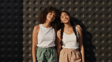Portrait of two young women confidently leaning against a white background with relaxed smiles and crossed arms. A representation of friendship, confidence, diversity, and empowerment ideal for lifestyle, community, or branding content.