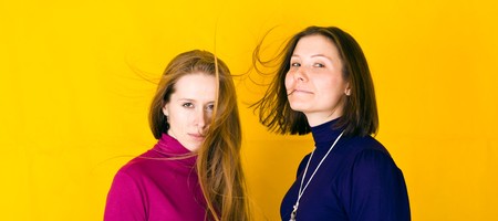 Two young girls standing side by side, each wearing a different colored shirt. The girl on the left is wearing a pink shirt, while the girl on the right is wearing a yellow shirt. Both girls have long brown hair and are smiling at the camera. The background of the image is a solid peach color.