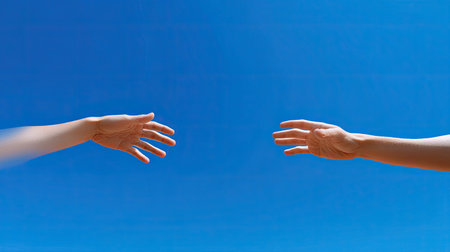 Two hands reach toward each other against a clear blue sky, symbolizing connection, hope, and the beauty of human interaction in a peaceful environment.