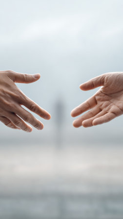 Close-up of two hands reaching out against a cloudy sky background, symbolizing hope, resilience, and the human desire for connection. --chaos