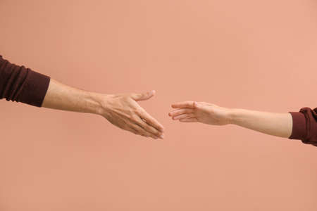Closeup of two female arms reaching each other hand isolated over light pink background