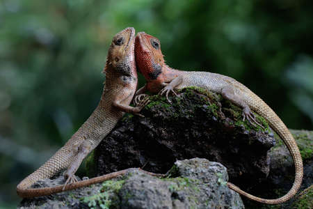 Three oriental garden lizards are sunbathing on a moss-covered rock. This reptile has the scientific name Calotes versicolor.