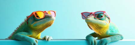 Stylish iguana reptile friends group in sunglass on solid vibrant backdrop for advertising campaigns