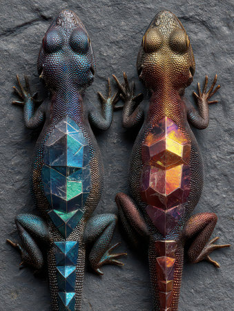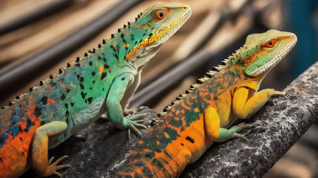 Two stunning lizards exhibit vibrant colors and geometric patterns along their bodies. This close-up captures their intricate details against a textured surface, showcasing nature's artistry.