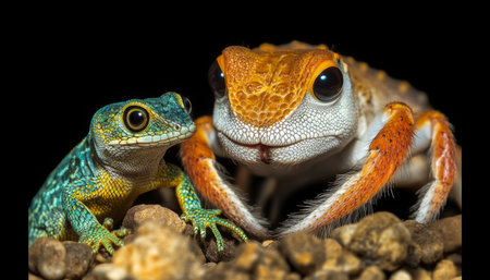 Vivid Reptilian Encounter. Colorful Lizard and Bold Red Spider Portrait on Textured Rock Background