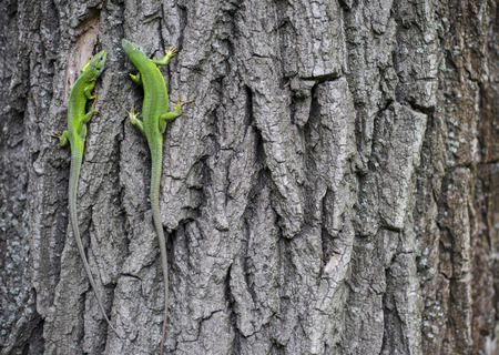 Two green emerald glossy geckos lizards sunbathing on a rock during a hot sunny summer day