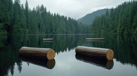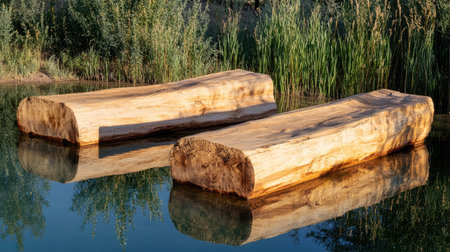 Two large, rustic wooden logs float gracefully on a calm water surface, reflecting the surrounding lush greenery in a serene nature landscape.