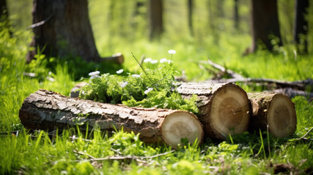 Tree stumps in a forest with logs in the background portraying deforestation. Capture of nature and woodcutting impact on environment.