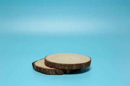 Round log cut with wood texture with crevices and knots, blue tinted wood background