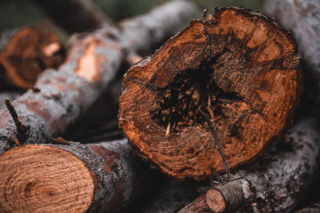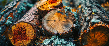 Closeup cross section of wood after deforestation stacked as woodpile, showing annual rings and age of trees for lumber and timber industry as sustainable resources on wood log and tree carcass